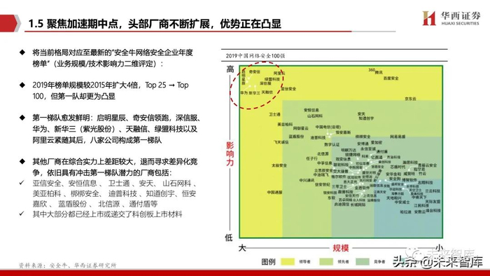 将分散格局对应至安全牛网络安全企业年度榜单(业务规模/技术影响力二维评定)来看则更为清晰。2015年:仅启明星辰、天融信在榜单中展现相对领先的综合实力,构成头部厂商,身后卫士通、深信服、绿盟则仍在快速追赶。而其他各类厂商基本囤居中游、各自为战,同时以360为代表的新兴厂商持续入局,市场竞争极其激烈。