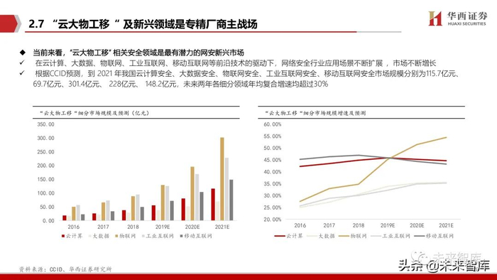 专精型厂商:在细分领域呈现特色竞争优势。目前A股专精型厂商主要包括北信源、卫士通、数字认证、格尔软件、中孚信息、以及科创板上市的安恒信息、山石网科和安博通。专精型厂商的特点在于,在特定细分领域往往有明确的优势,但是其在通用安全产品层面(如防火墙、入侵检测、SOC、数据安全)竞争实 力较弱,且没有明确的向此方向扩张的预期。但在技术含量和技术壁垒相较于全能型厂商仍有差距。业务的拓展受到较大限制,未来发展很大程度上取决于该细分领域的景气度,目前看云大物工移等新兴安全领域机遇较大。