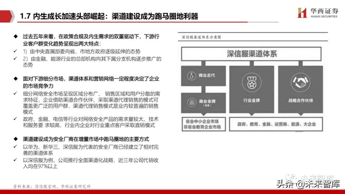 渠道建设成为安全厂商在增量市场中跑马圈地的主要方式 。以华为、新华三、深信服为代表的安全厂商已经建立了相对完 善的渠道体系 。以深信服为例,公司推行全面渠道化战略,近三年公司代销收 入均在97%以上。