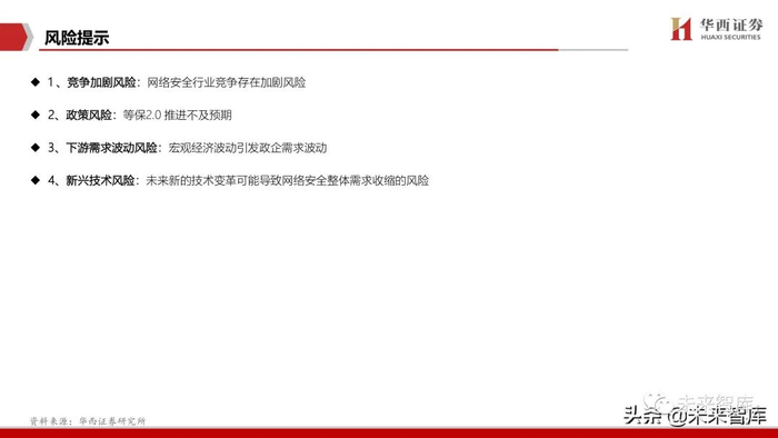 我国安全服务市场还处于萌芽发展阶段,随着下游分散招标模式的放开,基于一体化解决方案的安全服务有望成为头部厂商新增长点。目前,部分细分领域已经具备较高的行业集中度,看好同时在多个细分领域具备卡位优势的头部厂商进一步扩张。安全服务是厂商一体化服务重要组成部分,也是当前头部厂商的重点发力领域,正逐步成为新的增长引擎