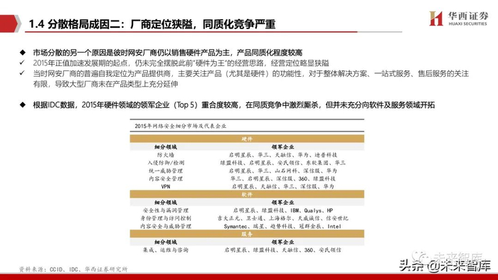 市场分散的另一个原因是彼时网安厂商仍以销售硬件产品为主,产品同质化程度较高。2015年正值加速发展期的起点,仍未完全摆脱此前“硬件为王“的经营思路,经营定位略显狭隘。当时网安厂商的普遍自我定位为产品提供商,主要关注产品(尤其是硬件)的功能性,对于整体解决方案、一站式服务、售后服务的关注 有限,导致大型厂商未在产品类型上充分延伸。