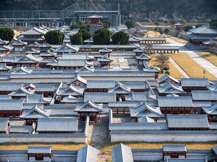 大明宫微缩景观位于大明宫遗址博物馆东侧,是以1:15的比例真实地还原了全盛时期的整个唐大明宫宫殿群。 大明宫遗址博物馆官网 图