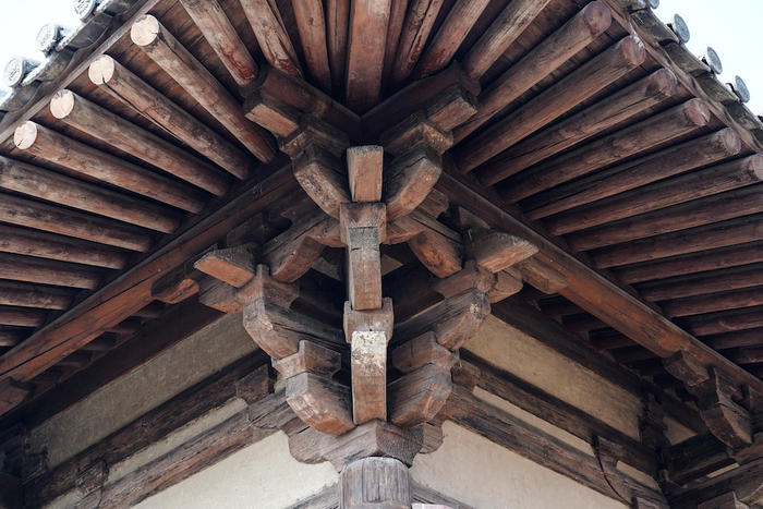 佛光寺位于五台县豆村镇,东大殿为其主殿,建于唐大中十一年(公元857年)。东大殿集中体现了唐代木构建筑“斗拱雄大,出檐深远”的特点,巨大的屋顶下有着设计极为严谨的木结构铺作层,斗栱分内外两圈排列,不光是用来承接屋顶的重量,还支撑起屋顶飘逸造型的内部架构,因此它也是是现存中国古建筑中斗拱挑出层数最多、距离最远的一个实例。