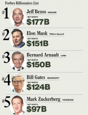 从全球范围来看,排名第一的是即将卸任亚马逊CEO的贝索斯,身家1770亿美元,他已经连续第四年蝉联今年的富豪榜榜首。紧接着是特斯拉CEO马斯克,身家1510亿美元,他从去年的第31位飙升至第2位。路易·威登集团的伯纳德•阿尔诺跟去年一样,仍排在第3位,身家1500亿美元。紧随其后的是排名第4的比尔•盖茨,身家1240亿美元。今年排名第五的是Facebook的马克·扎克伯格,身家970亿美元。值得一提的是,沃伦•巴菲特排名第六,这是他20多年来首次未能跻身富豪榜前五位,不过巴菲特960亿美元的身家仍比2020年高出285亿美元。