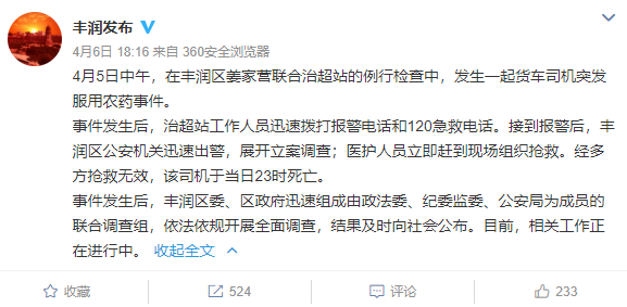 近日,河北沧州货车司机因北斗定位掉线,被扣车罚款2000元后自杀。据丰润区政府新闻办官方微博发布的公告,丰润区政府已成立联合调查组,针对此事开展全面调查。
