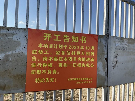 围挡上的告知书写着“望各位村民互相转告,请不要在本项目内地块再进行种植”,白色的宣传语则写着“筑梦深海”、“逐梦自贸港”等。围挡内塔吊林立,一座又一座高楼大厦正在拔地而起。