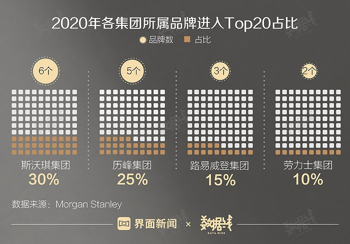 2020年腕表品牌销售额Top20中,有16个品牌出自四大腕表集团。其中,斯沃琪集团有6个品牌(欧米茄、浪琴、天梭、宝玑、宝珀、雷达)上榜,历峰集团有5个品牌(卡地亚、万国、积家、江诗丹顿、沛纳海)上榜。从品牌数量上看,两者占了“半壁江山”。