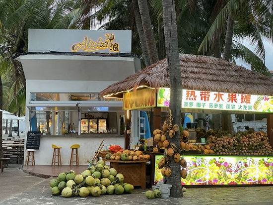 日月湾以浪高闻名,越来越多的冲浪高手开始聚集于此。景区只有500米长,景区内的冲浪小店和水果摊 图片来源:界面新闻