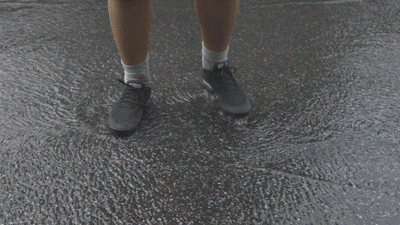 模拟雨天行走的场景,分别穿了量程鞋和普通鞋,在水坑里走。