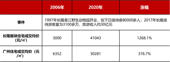 广州长隆旅游度假区,十多年前房价仅3000余元/㎡,而长隆进驻后,目前房价已接近市中心房价,多个楼盘商品房价格已超5万元/㎡。