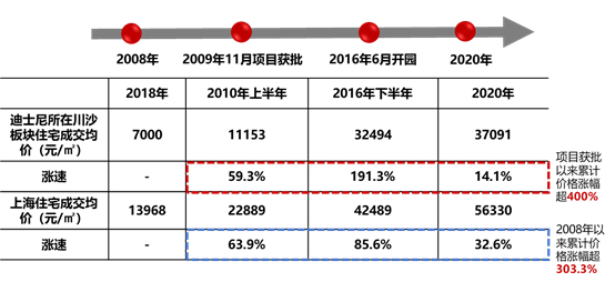 与此同时,文旅主题乐园的建设,不仅带动人气的聚集,拉动区域经济、交通、产业甚至城市的快速发展,而且对区域房价的保值增值也起到重大的支撑。如上海迪士尼,自2009年11月项目获批以来,截至2020年其所在的川沙板块住宅成交价格涨幅超400%,远超上海市整体房价上涨速度。2020年,个别楼盘商品房价格已超7万/㎡。