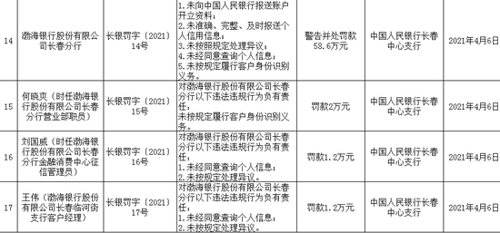 渤海银行长春临河街支行客户经理王伟对该行未经同意查询个人信息、未按规定处理异议的违法违规行为负有责任,被罚款1.2万元。