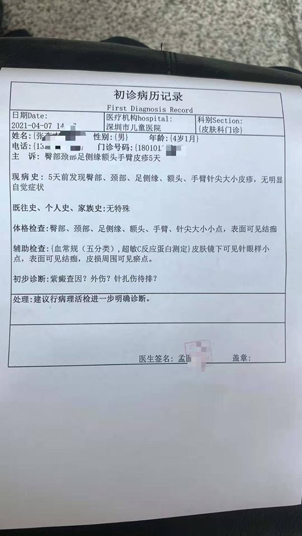 4月7日,张先生将阳阳送到深圳市儿童医院进行检查。初诊病历显示:体格检查发现阳阳臀、颈、足侧缘、额头、手臂针尖大小小点,表面可见结痂。初步诊断为“紫癜查因?外伤?针扎伤待排?”