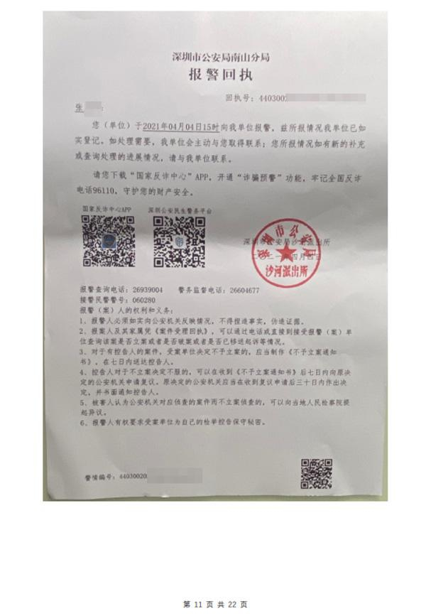 深圳市公安局南山分局沙河派出所报警平台工作人员告诉澎湃新闻,警方已接到张先生的报警,目前由派出所里的侦办队处理。