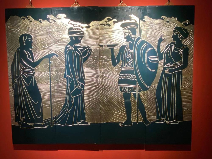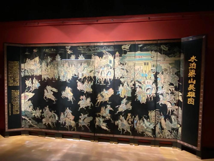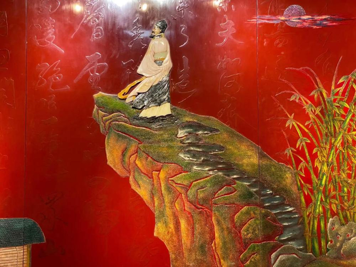 在艺术馆大厅里,《清明上河图》、《水泊梁山英雄图》、《宋代青龙镇繁华图》等几十款大型彩色地屏漆器作品,一一呈现在参观者面前,让人惊叹。其中,历经五年构思制作完成的大型款彩地屏《宋代青龙镇繁华图》,长5.9米,高2.6米,还原宋代青龙镇繁荣的市井人文图景,在继承传统漆艺构思工艺和工匠精神的基础上,融入海派漆器的创作理念,努力贴近当下审美追求,在制作全流程进行创意突破,成为当下海派漆艺的一个标杆作品。