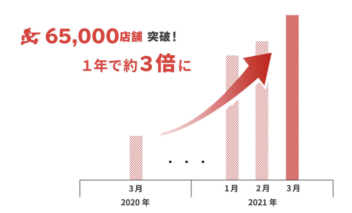 现阶段,日本最大的外卖平台是Uber Eats和出前馆。其中,出前馆是有着较长经营历史的日本本土平台,根据其官网上的最新信息,出前馆2021年3月25日的加盟店铺数量已突破65000,相比一年前翻了约三倍。