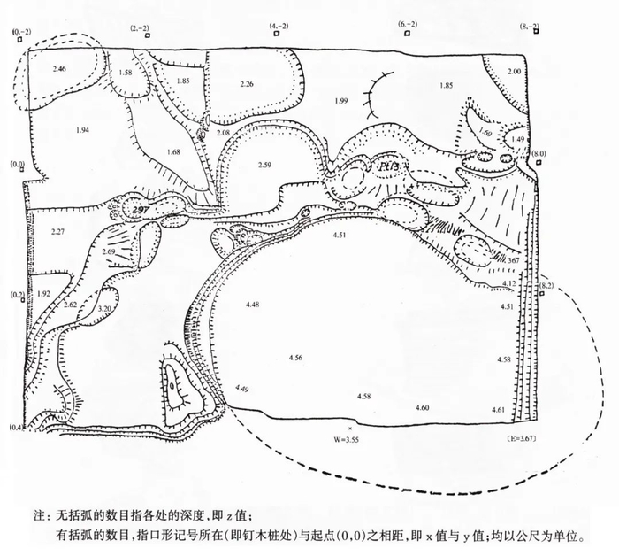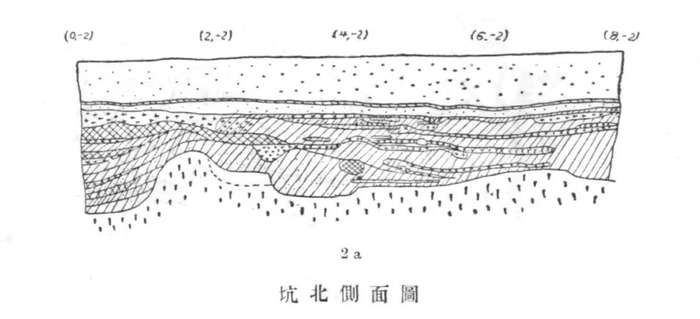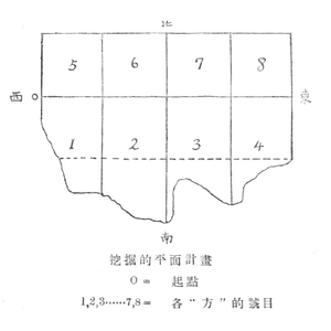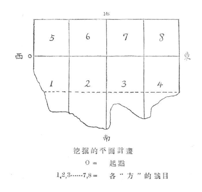 在这样小的一个发掘区域内,李济又划分出8个小“方”,并以阿拉伯数字编号。北边4个,边长各2米;南边4个,因断崖不齐而略有参差。这种人为划分出来的方形发掘区域,既可以控制发掘范围,同时又作为发掘单位,实际上就是田野考古中最基本的发掘方法——探方发掘法的雏形。在各“方”交界的位置,都留有“土尖”为最后研究土层变迁的材料。结合当时的照片,可知李济所说的“土尖”实为上窄下宽、横截面呈近正方形的锥形土柱,底边长约0.7~0.8米,就其“为最后研究土层变化的材料”的功能而言,实为今天探方发掘法中“关键柱”的雏形。在对发掘区域做了这样的规划之后,李济采用“披葱式”发掘法进行发掘。所谓“披葱式”,像剥洋葱似的一片一片地剥下来,其实也就是按照水平层与自然层相结合的方法向下清理。以1米为一个水平层单位,每层再根据土质土色及容积细分亚层。亚层的划分非常细致,以第4“方”为例,从表土层往下把4米左右的文化堆积划分了33层。每一水平层按上下次序用大写英文字母编号,亚层用小写英文字母编号,加上每一小“方”的编号,就可以将每一亚层的出土物用3个简单的字符表示。“假如有一堆物件上边标的是B4c,这号码的意思是:这堆物件是由第四‘方’,第二层,第三分层找出来的。这个第三分层的深度在记载薄上找出来的是1.17~1.25公尺。”李济把这种对遗物的记录方法称作“层叠法”。而对于重要的遗物,则用“三点记载法”记录空间位置。以设定的发掘零点为原点,东西向用x表示,南北向用y表示,垂直方向用z表示,“三点就是x—y—z用米达尺表达出来的三价值。”此次发掘用“三点记载法”记录的遗物总数在2000个以上,每一个都标有号码并标注其出土时间。今天田野考古中对陶片等普通遗物和小件的记录仍基本沿袭这种方法。