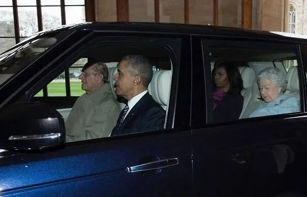 ·菲利普亲王(左一)亲自开车带着奥巴马夫妇和女王伊丽莎白二世。