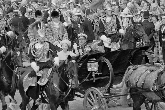 当地时间1977年6月7日,英国伦敦,英国女王伊丽莎白二世和丈夫菲利普亲王乘坐马车参加女王登基25周年庆典。