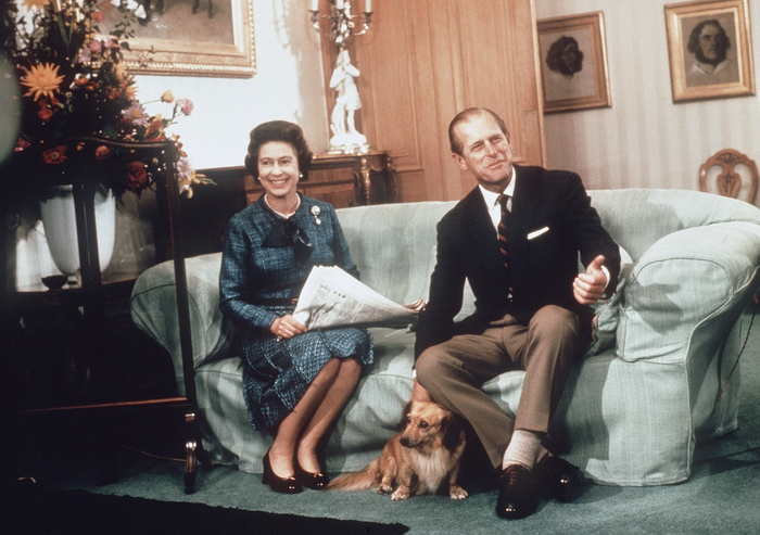 1975年,巴尔莫勒尔堡,伊丽莎白二世女王和爱丁堡公爵菲利普亲王与爱狗合影。