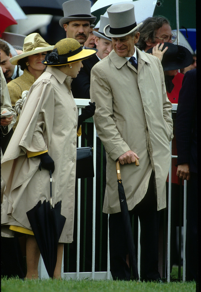 当地时间1990年6月6日 , 身穿雨衣的女王伊丽莎白二世和菲利普亲王参加活动 。