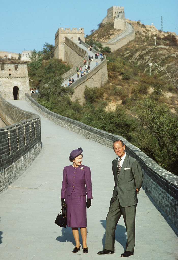1986年 , 英国女王伊丽莎白二世和菲利普亲王访问中国时 , 在长城合影 。