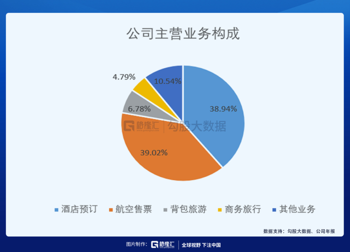 1999年,创始人梁建章当年从美国硅谷回国创业,组成了人称“携程四君子”的创业团队。经过互联网创业大潮的洗礼,公司 2003年于纳斯达克上市,如今携程是国内OTA行业的老大哥,经营的品牌包括携程、去哪儿网、Trip.com、Skyscanner(天巡)。主要业务包括酒店预订(占比38.94%)、交通票务(39.02%)、背包旅游(6.78%)、商旅旅行(4.79%)等。