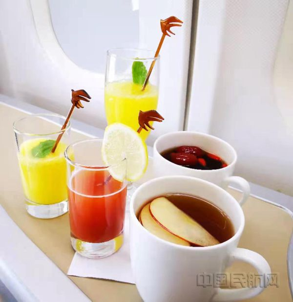 “匠心•醇享Enjoyment”系列包括“臻”、“醇”、“沁”“润”四款,分别面向蔬果特调、养生热饮、气泡果汁和东方茶饮等不同饮品需求,部分饮品还能为旅客提供全糖、半糖、少糖的甜度选择。其中,“沁”的主打为“明亮前橙”,将橙汁与其他饮品融合,再佐以薄荷的芳香。“臻”的主打为“日出东方”,是以番茄汁为主的特调饮品,并加入苏打水、柠檬,形成混合的芳香口感。“润”的主打饮品为“天苹地安”,由苹果汁与红茶搭配,暖心暖胃。“醇”的主打饮品为“万家灯火”,是由普洱、红枣、枸杞搭配的养生茶。