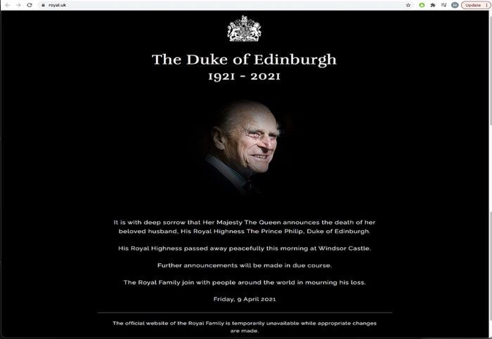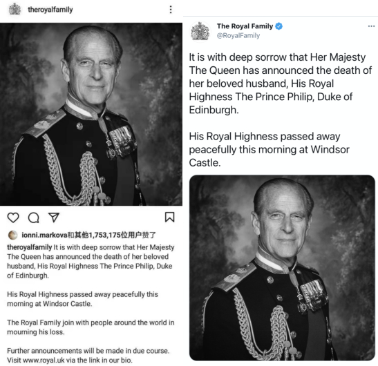 “女王陛下怀着沉痛的心情宣布她亲爱的丈夫,菲利普亲王殿下,即爱丁堡公爵去世,今早在温莎城堡平静辞世。”英国王室也在其Instagram和Twitter社交媒体账号上同步了这一消息。