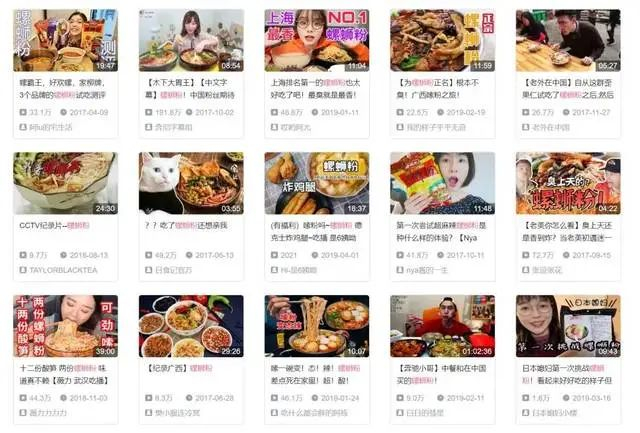 打开B站,搜索“螺蛳粉”,有一个专门的“螺蛳粉”频道,其中有9625个视频,1.3亿播放,127个精选视频,播放超过100万的视频有15个,其中李子柒的视频播放量最多,达521万,评论达4万。 图片来源于网络