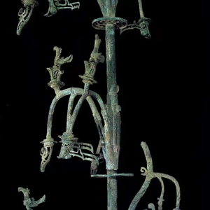 圆形的底座上,分成三段、套接而成的圆杆状树身向上延伸,生出九根弯弯的枝条,或上扬或下垂,向上的枝上立着一只昂头的鸟,一条龙只剩半个身子,头朝下地悬在树干旁侧,尾部缺失。