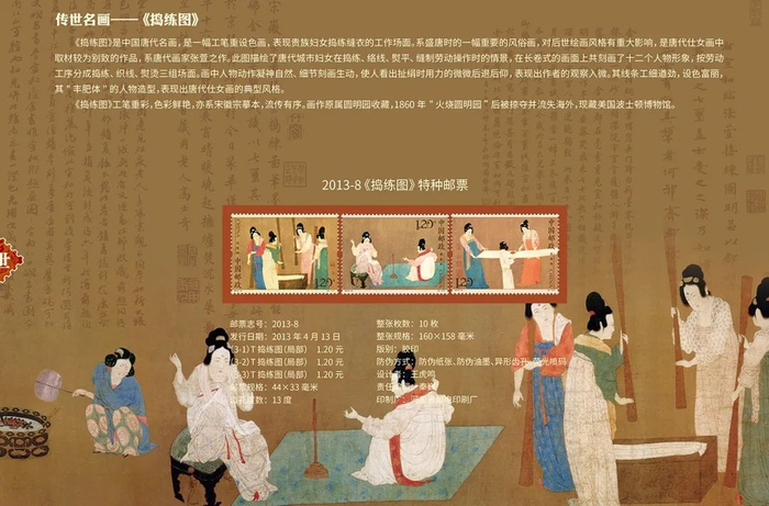 《捣练图》邮票采用“高网线+调频网”以及专色、多色等复杂印刷工艺,运用高超的技艺对细节进行调试与处理,完美再现了原画之美、之精。拥有它就相当于拥有《捣练图》原画。