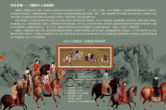 《虢国夫人游春图》邮票在设计上采用两枚连印的形式,并对原画进行了必要的剪裁。邮票的两幅画面既浑然一体,又各自相对完整。