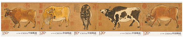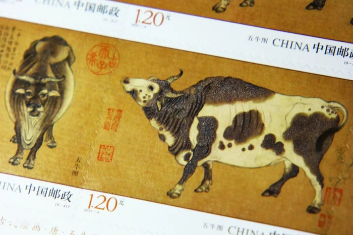 《五牛图》邮票是首套采用胶雕版别印制的中国传统古画的动物画邮票,根据五头牛在原画中的布局采用多样化的票幅设计,充分还原了五头牛的灵动与风采。
