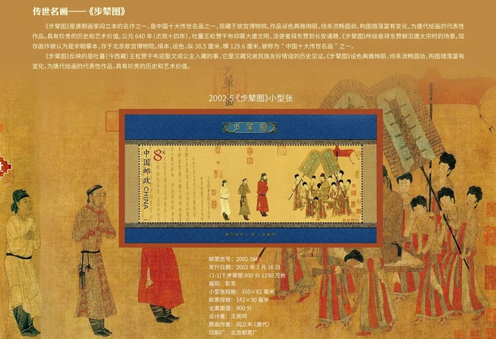 《步辇图》邮票记录了一千余年前大唐与边远民族的友好交往,是2002年发行的第一枚小型张邮票。
