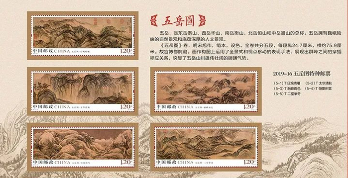 《五岳图》邮票设计完整,展现了《五岳图》图卷的原貌,颜色古朴厚重,设计简洁大气,整体风格清新雅致。
