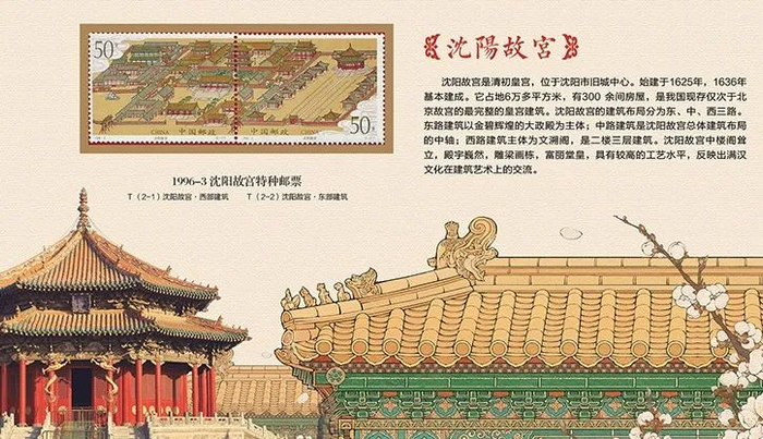 《沈阳故宫》特种邮票展现了沈阳故宫全景,构成一幅雄伟壮观的鸟瞰图画。