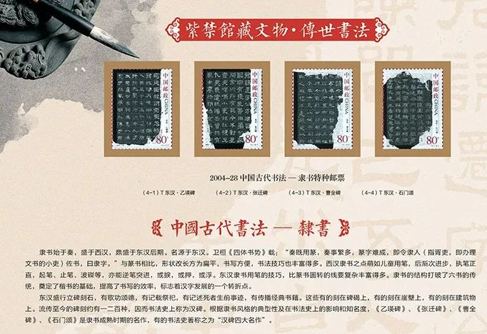 隶书邮票的图案分别选取自中国历史上隶书书法影响最大的“四大名品”:《乙瑛碑》《张迁碑》《曹全碑》《石门颂》。
