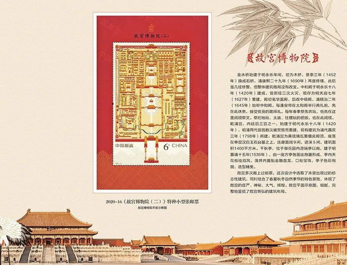 故宫小型张是中国邮政首次发行,由著名邮票设计家阎炳武先生亲自操刀设计。阎炳武对小型张图案上的屋顶、廊柱反复进行了考证,将故宫建筑群的恢弘之美展现得淋漓尽致。