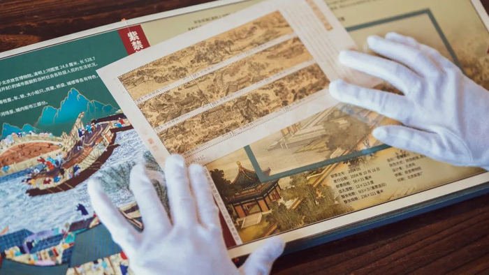 珍邮大全典藏册中有11套名画邮票均为国家邮政局印制局主任设计师王虎鸣设计,其中《四景山水图》《步辇图》和《清明上河图》邮票均获奖。