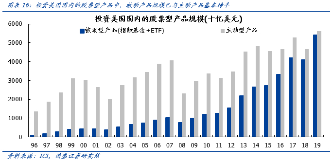 2008年金融危机后,美国被动型产品加速扩容并开启了对主动产品的替代。根据ICI的数据显示,2010年至2019年期间,投资美国国内的主动型股票基金遭遇了累计1.7万亿美元的资金净流出,与此同时投资美国国内的指数型股票基金和指数型股票ETF却合计获得了1.8万亿美元规模的资金净流入。至2019年底,投资美国国内的股票型基金产品中,包括指数基金和ETF在内的被动型产品合计已达5.4万亿美元,规模基本追平主动型产品。