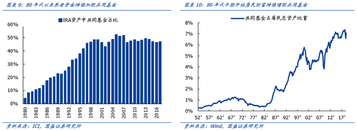 90年代,美股市场迎来机构投资者崛起的时代,共同基金也迎来进一步的繁荣。随着80年代美国养老体制改革,养老资金为共同基金行业注入了源源不断的长期资金,并且这一趋势在90年代后更为明显,1992年DC计划和IRA分别持有共同基金资产1840亿和2410亿美元,占彼时共同基金规模的38.8%,至2000年,DC计划和IRA持有的共同基金资产已分别上升至12850亿和12650亿美元,同时占共同基金规模比重也上升至49.8%。这些共同基金持有股票资产长期在6成以上,成为推动当时美股牛市行情持续的最大底层增量资金来源。