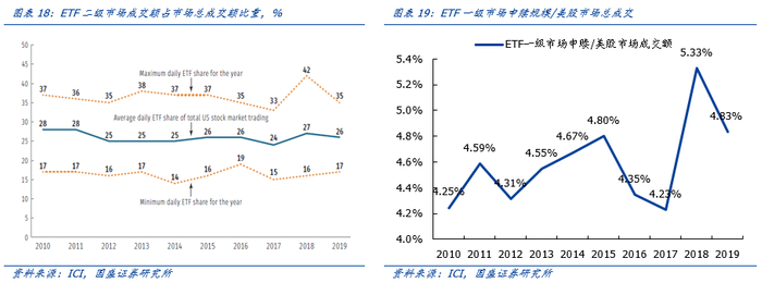 此外,需要提示是,市场普遍对ETF存在一个误解,即在市场大幅下跌时投资者会赎回ETF从而加剧调整的烈度。比如2020年3月全球流动性危机、美股市场大跌之际,部分投资者一度将ETF赎回归为市场下跌的重要原因。然而,根据ICI的数据,美国国内股票ETF二级市场成交额占美股市场总成交额的比重常年保持在26%左右。而即使在股市大幅波动的2018年,美国国内股票ETF申赎规模也仅美股市场65.7万亿美元总成交额的5.3%,远低于二级市场交易规模。显示当市场大幅波动之际,ETF投资者主要通过二级市场交易实现对持仓的调整和风险的出清,而不是一级市场赎回。