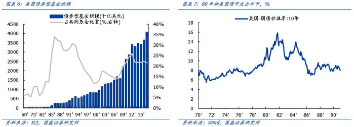 随着美国利率实现自由化,叠加美国经济回暖,利率水平有所抬升,债券市场陷入震荡,1986年后债券型基金比重逐步回落。同时,美股牛市持续展开,美国共同基金业最终进入股票基金时代。