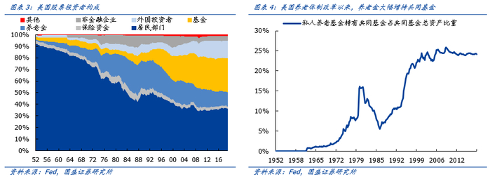 至70年代,美国开始养老体制改革。1974年《雇员退休收入保障法案》(ERISA) 开始实施,为不享受雇主养老计划的工人提供个人退休账户(IRA),并于1981年的经济恢复法案后扩大到全体雇员;1978年《国内税收法》401(K)、403(B)及457条款,规定政府机构、企业及非营利组织等不同类型雇主,需为员工建立积累制养老金帐户,并可以享受税收优惠。1981年又追加了实施规则。此后,雇主养老金计划特别是DC计划规模实现了快速的增长,并通过直接投资或通过共同基金间接投资,带动大量沉淀资金持续流入美国资本市场。