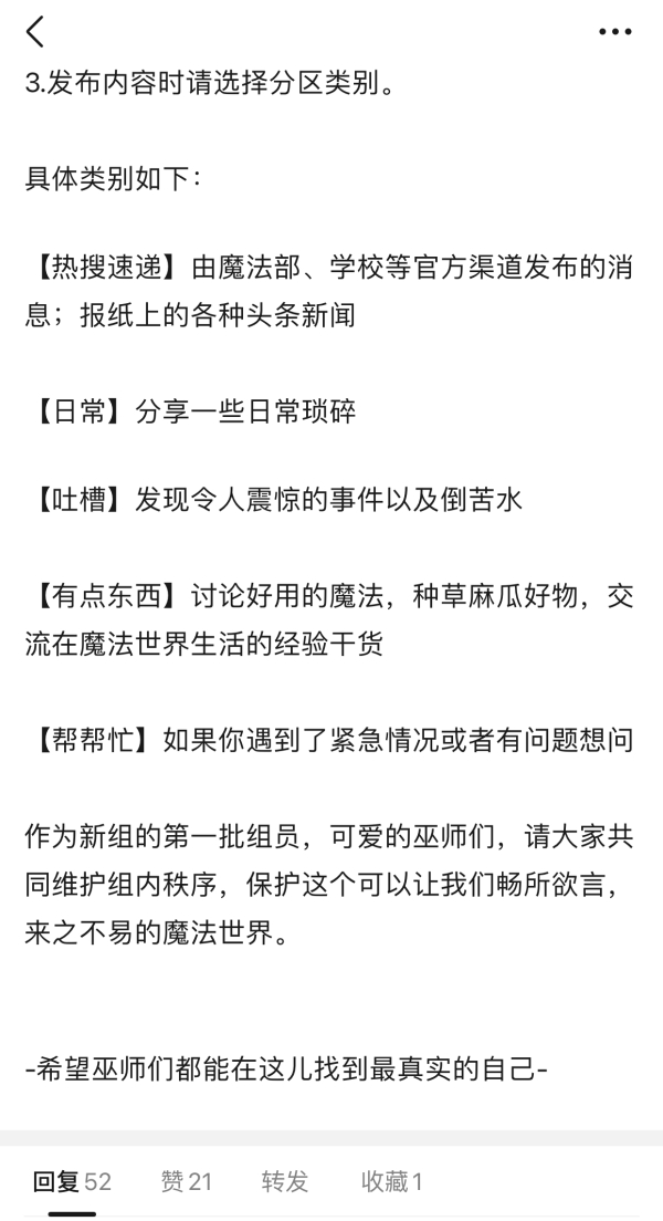 正如魔法世界组发起人在组规中所写,“希望巫师们都能在这儿找到最真实的自己。”