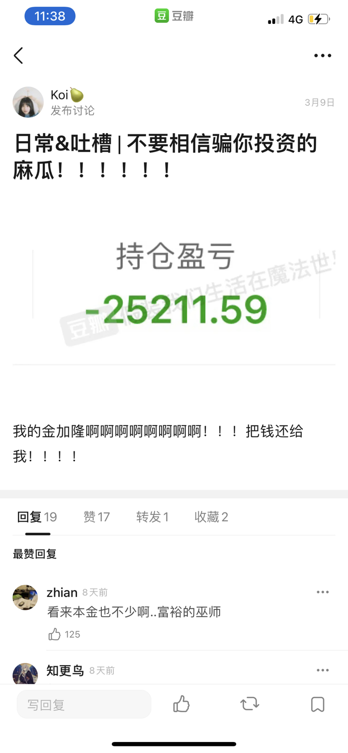当然,现实中理财失败也可能反映在魔法世界里。一位组员大呼“不要相信骗你投资的麻瓜!!!”,配图是一张绿油油的持仓盈亏,在帖子里她抱怨着金加隆(《哈利波特》系列中最有价值的巫师货币)消失不见,而同样惨遭亏损的巫师回复道:“黄油啤酒也喝不起了”。