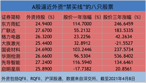 相比A股年报和季报披露的外资持股仓位,交易所预警名单上的外资重仓股信息更加实时。深交所名单显示,截至2021年4月8日,8只股票的外资持股比例在24%以上。