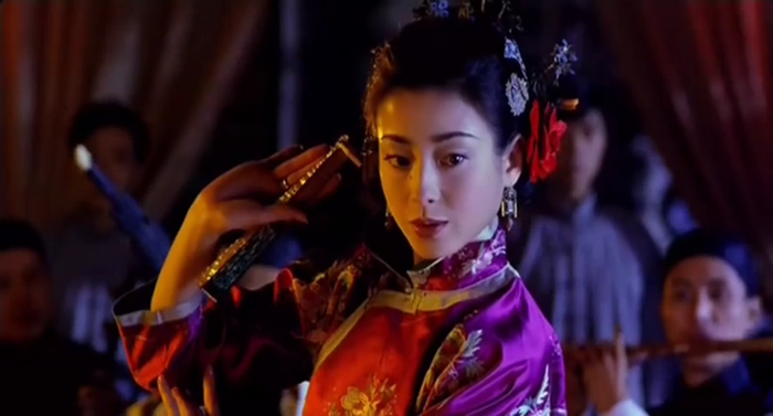 她去给老爷唱曲之前,穿着喜庆的紫红色龙凤褂,对镜精心梳妆,忐忑等来请她赴约的管家们时,由于太过紧张,站起的身体微微发颤,并弄掉了手中表演用的折扇。二管家急步向前,打算将她扶定,但大管家的斥责提醒,令他醒悟规矩,只是低头捡起地上的扇子。