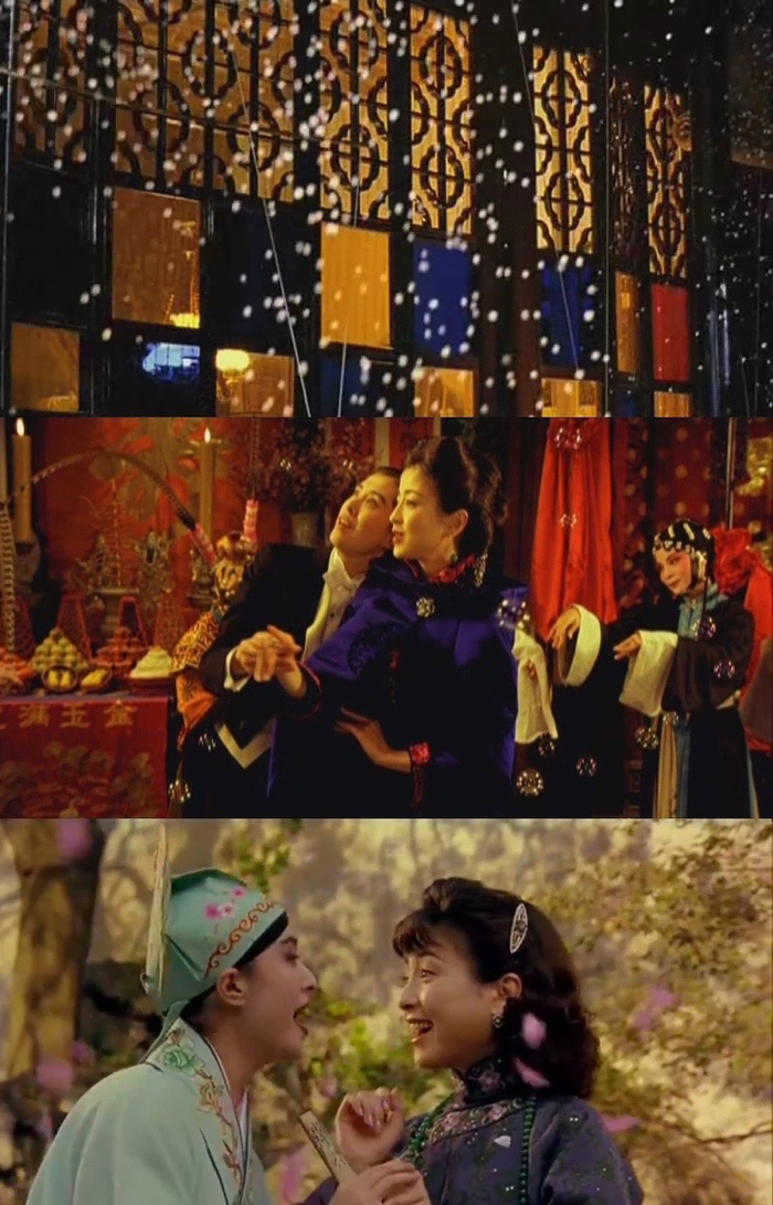 “痴梦”、“折柳阳关”与“惊梦”、“寻梦”一样,讲的都是女性的情事与心事,并皆由女性的盛装打扮引发,不过“折柳阳关”中霍小玉送别李益时头戴的凤冠、“痴梦”中崔氏得知被她“休掉”的落魄前夫朱买臣高中状元时梦见的霞帔,指向古代女性对于男性以及权势的依附,在后花园先“惊梦”后“寻梦”的杜丽娘,之所以“翠生生出落的裙衫儿茜,艳晶晶花簪八宝填”,是因她“一生儿爱好是天然”。此份天性使然,释放女性主动追求个人婚姻与幸福,尝试解放自身的讯号。由是,以汤翁的“临川梦”为代表的昆曲主题或元素,渗透进杨凡的电影时,虽然会令情节走向乖张怪诞(《桃色》《泪王子》中生死并存的混杂时空和情感,非常容易引来观众反感),但也让画面比《玫瑰的故事》《流金岁月》《意乱情迷》等他的其他影片愈发唯美浪漫,更使得主旨挣脱世俗或说偏见目光的束缚。其中《游园惊梦》达到了极致。